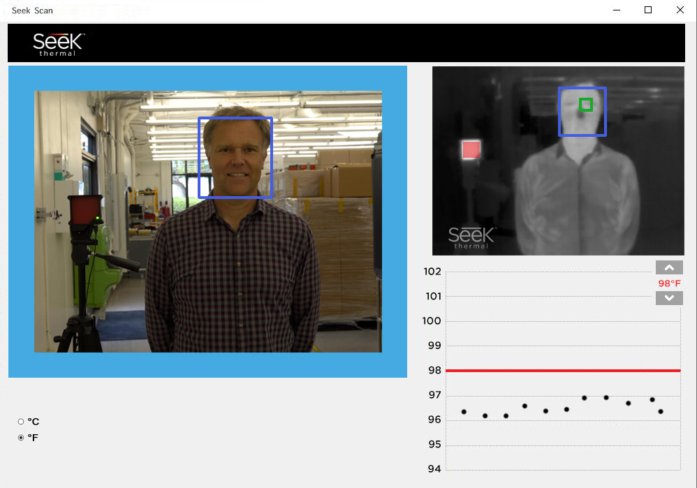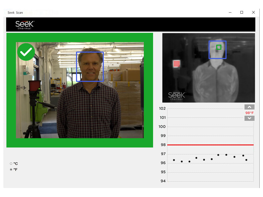 Seek Scan is a simple, low-cost, thermal imaging system designed to automate body temperature screening using skin temperature as a proxy. Unlike traditional screening methods, Seek Scan enables social distancing, self-measurement and finds the most reliable spot on the face for temperature measurement.